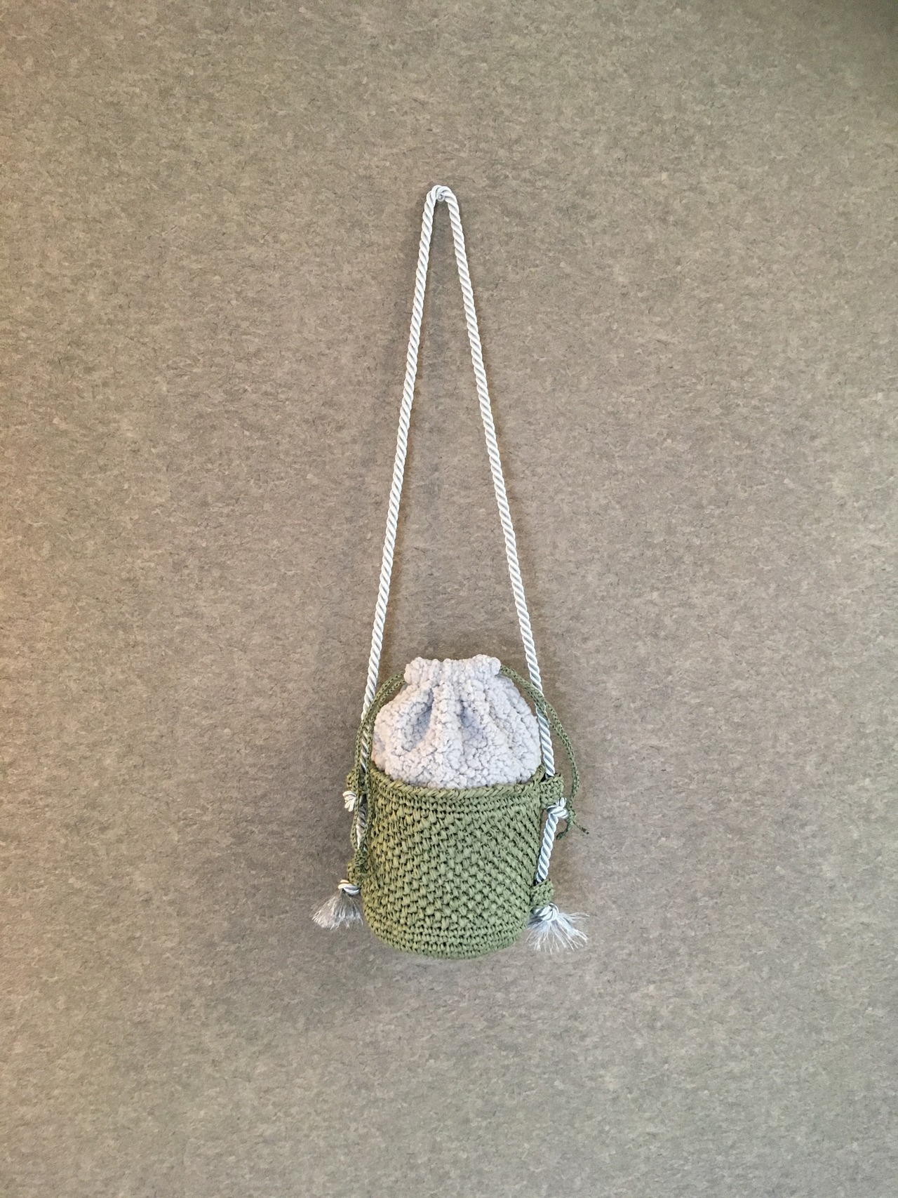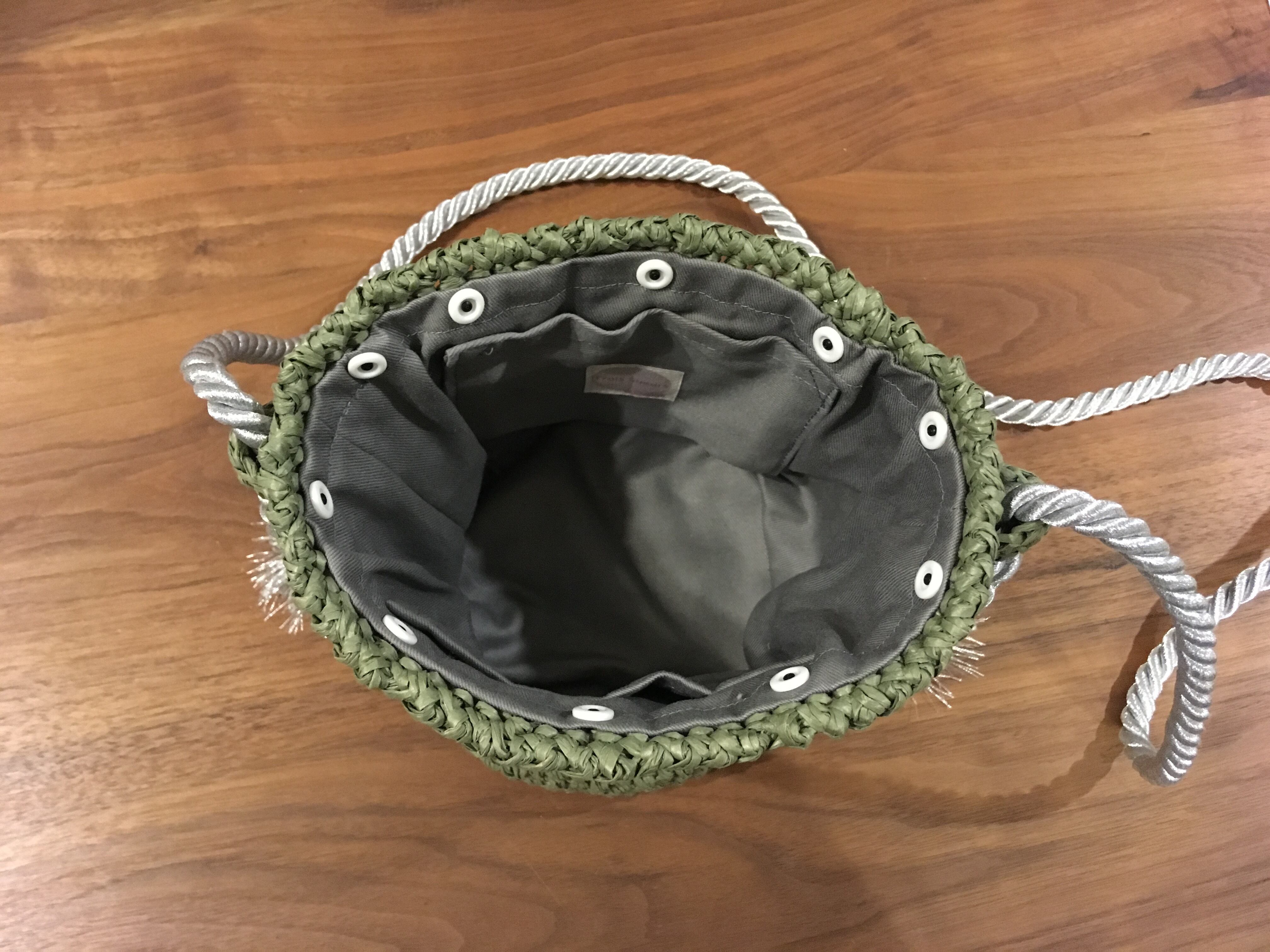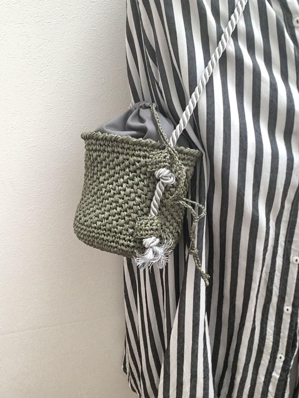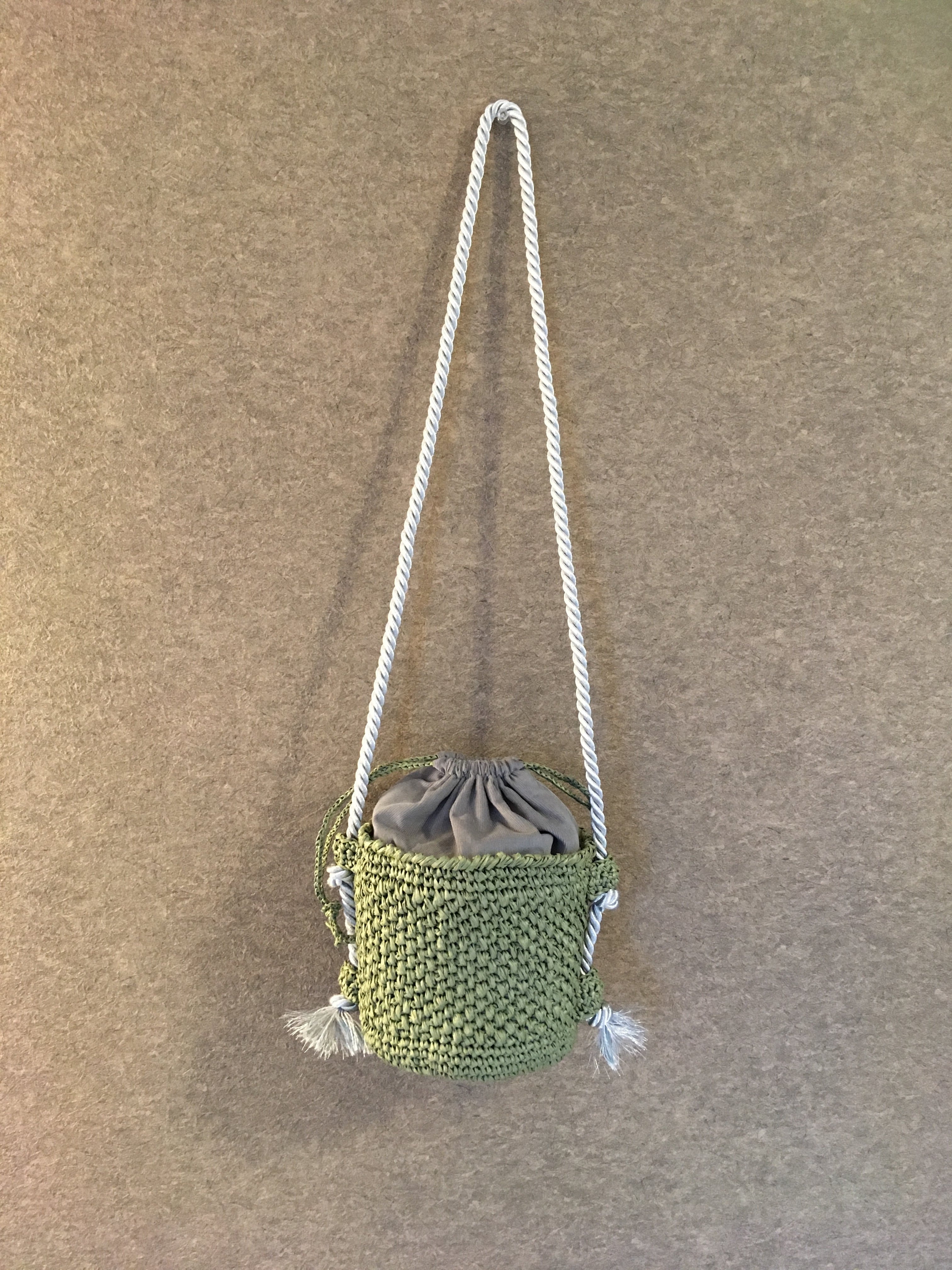 カーキ色の洗える和紙の糸でバッグを編み、オールシーズン使えるように内布の巾着部分を着せ替えできるようにしました。