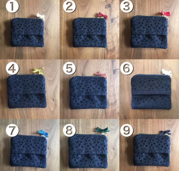 リボンは、ファスナー引き手に丸カンをつけて、丸カンに結びつけております。