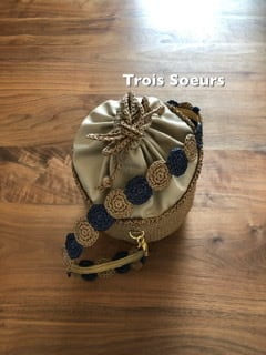 ・バッグ本体と同じカフェオレ色の和紙の糸で編んだ◯と、紺色の和紙の糸で編んだ●をつなげています。