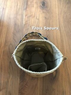 巾着紐は、バッグ本体の糸と同じカフェオレ色の和紙の糸で編んだ紐を使用しました。