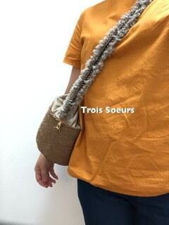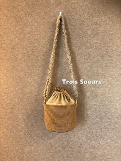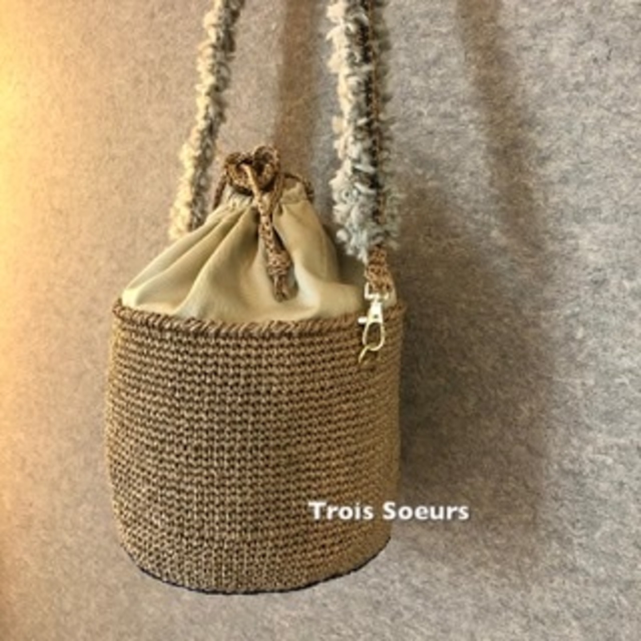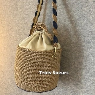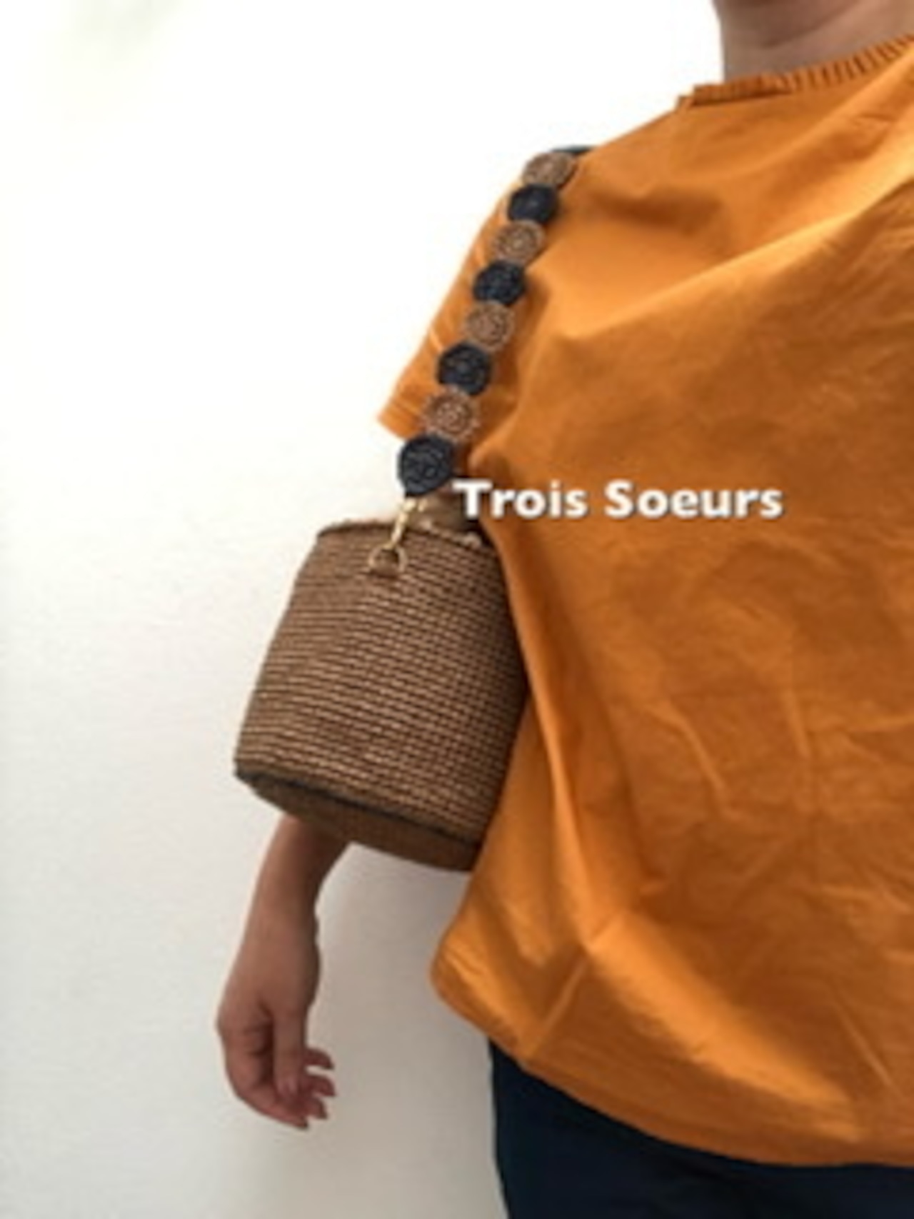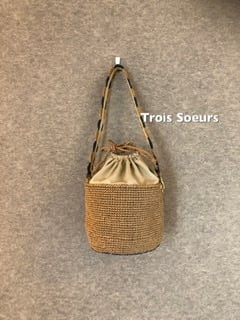 カフェオレ色の和紙の糸で編んだバケツ型のバッグに、取り外して着せ替えできるショルダーをつけました。