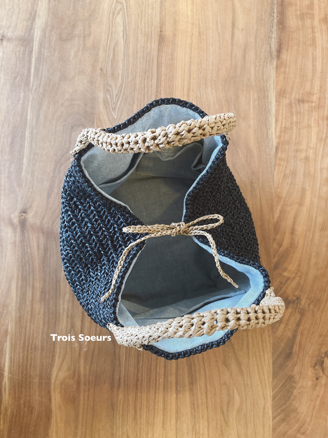 ブラックベースに薄いブラウンのステッチ、持ち手、口を結ぶ紐を合わせたバイカラー。